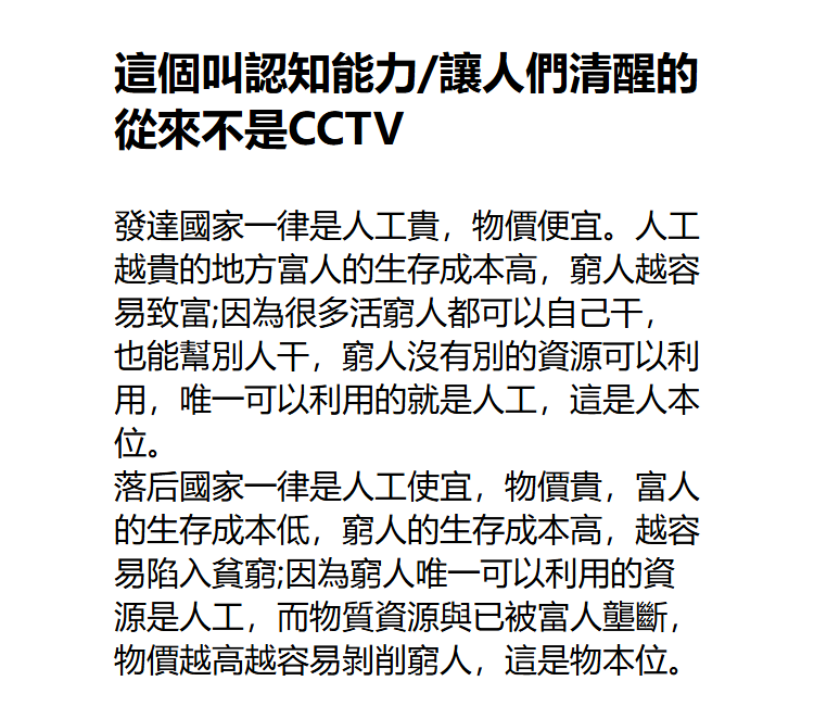 第二個意思,這本書里面已經多次講到了。我這幾年還有一個重要的認識,就是“理念、思想、觀念對人類的重要性”。人類的歷史某種程度上就是一種觀念歷史。所有人類的創新,甚至于物質上的合作其實都是從觀念變來的。我在這幾年對傳統講的歷史唯物主義產生疑問,因為歷史唯物主義沒有解決人類的很多問題。比如說生產力決定生產關系,有什么樣的生產力就會有什么樣的生產關系,這個東西是講不通的。我們看一下人類的歷史,其實你的生產力、技術很大程度上是由上層建筑來決定的,是由生產關系決定的。我們看一下中國和美國之間的比較,最新一些技術的創新都出現在哪兒?出現在美國,而不是出現在中國。那么我們唯一能找到的理由就是我們的產權制度約束了人們創造的自由。