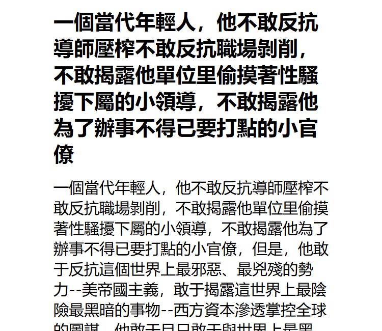 長期仇恨教育帶來的群體性后遺癥,就是只顧自己不顧別人,心中只有冷漠與自私,少有愛與憐憫,并且頭腦簡單極易被煽動,失去了獨立思考的能力。