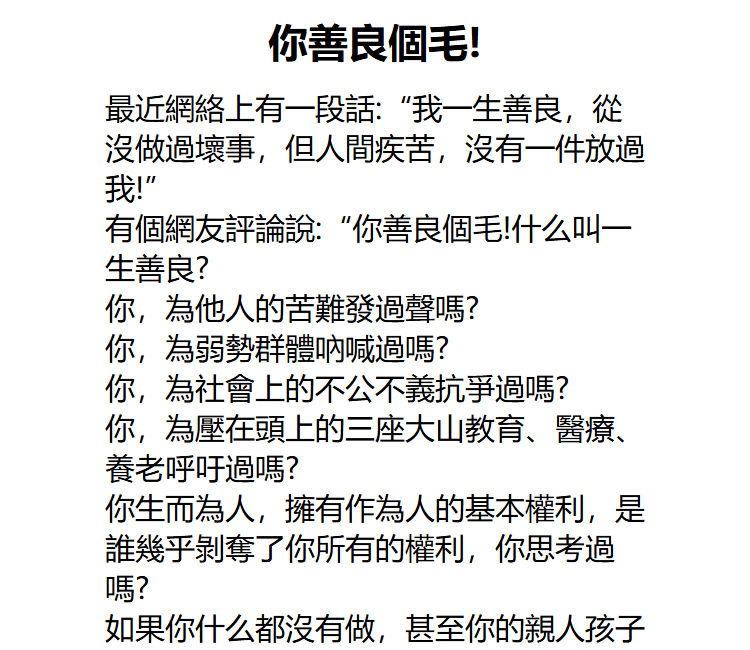 我內心很難受,這么多年過去了,經濟已今非昔比,但仇恨與自私卻一絲未減。