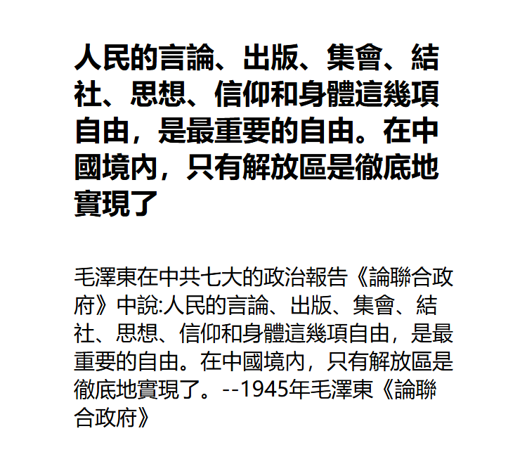 毛澤東在中共七大的政治報告《論聯合政府》中說:人民的言論、出版、集會、結社、思想、信仰和身體這幾項自由,是最重要的自由。在中國境內,只有解放區是徹底地實現了。--1945年毛澤東《論聯合政府》