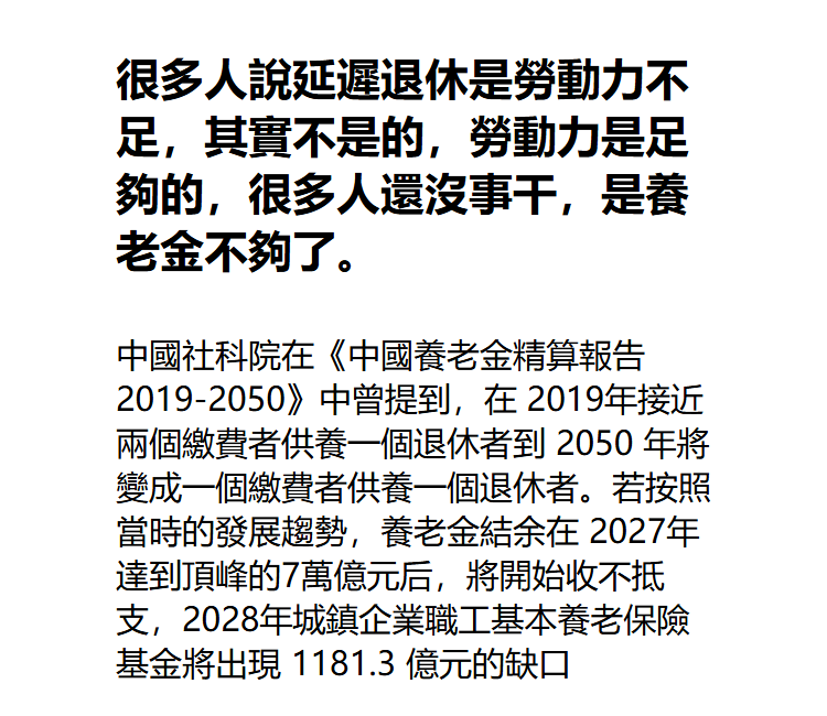 很多人說延遲退休是勞動力不足,其實不是的,勞動力是足夠的,很多人還沒事干,是養老金不夠了。