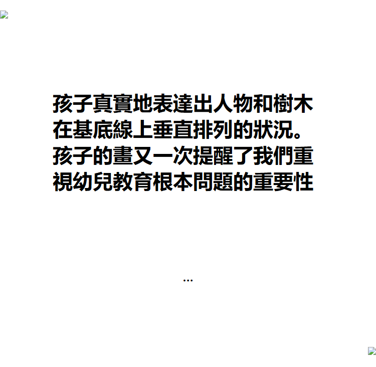 孩子真實地表達出人物和樹木在基底線上垂直排列的狀況。孩子的畫又一次提醒了我們重視幼兒教育根本問題的重要性